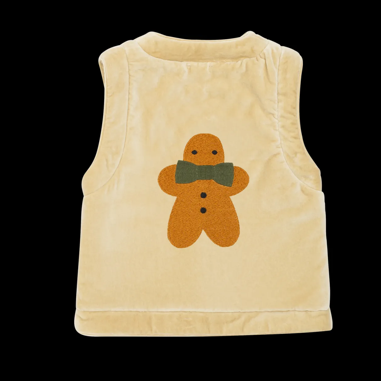 The Olaev Gilet features a show-stopping large gingerbread embroidered character on the back. Soft and cosy to wear, this will soon become a winter favourite. Featuring button fastenings along the front.
