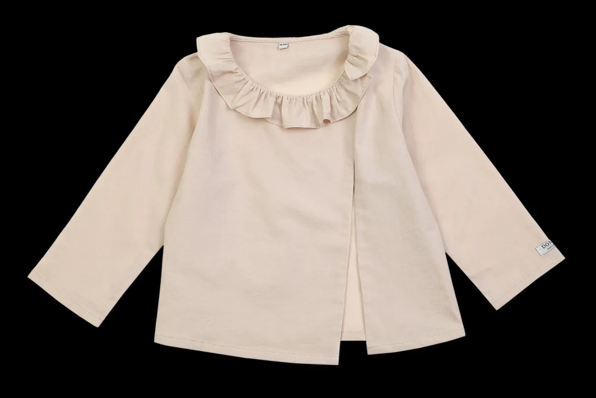 – Long sleeves, ruffled collar, relaxed fit