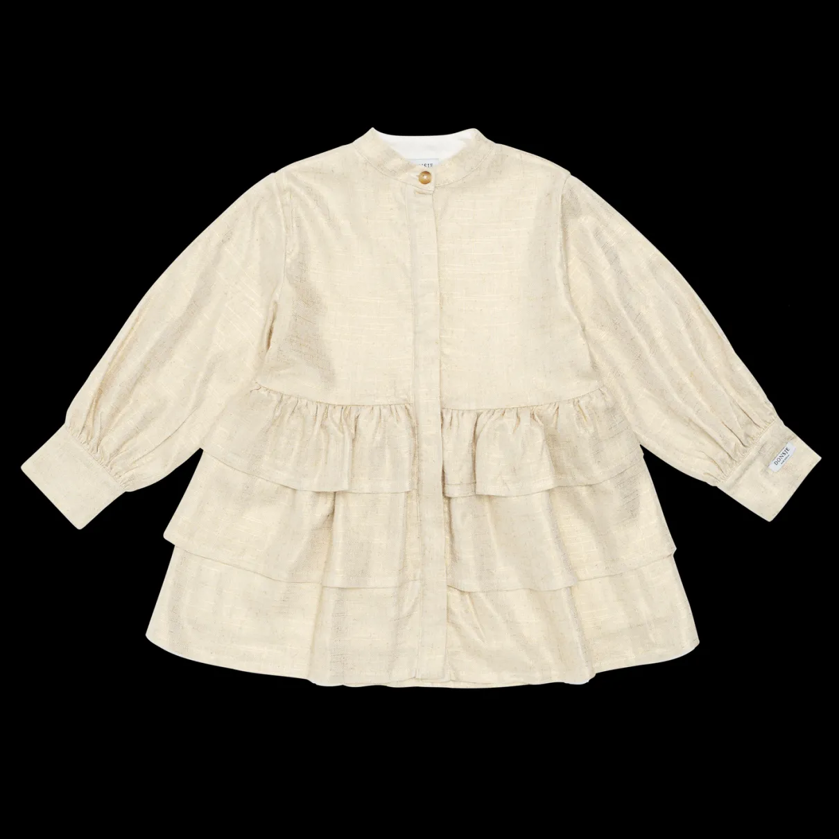 The charming Jazzley Dress features an elegant silhouette, complete with a layered and ruffled A-line skirt that brings a touch of festivity to any occasion. The shimmering gold metallic finish adds a seasonal glow, making it perfect for autumn and winter celebrations. Concealed button fastenings along the front and buttoned sleeves ensure both style and ease of wear.