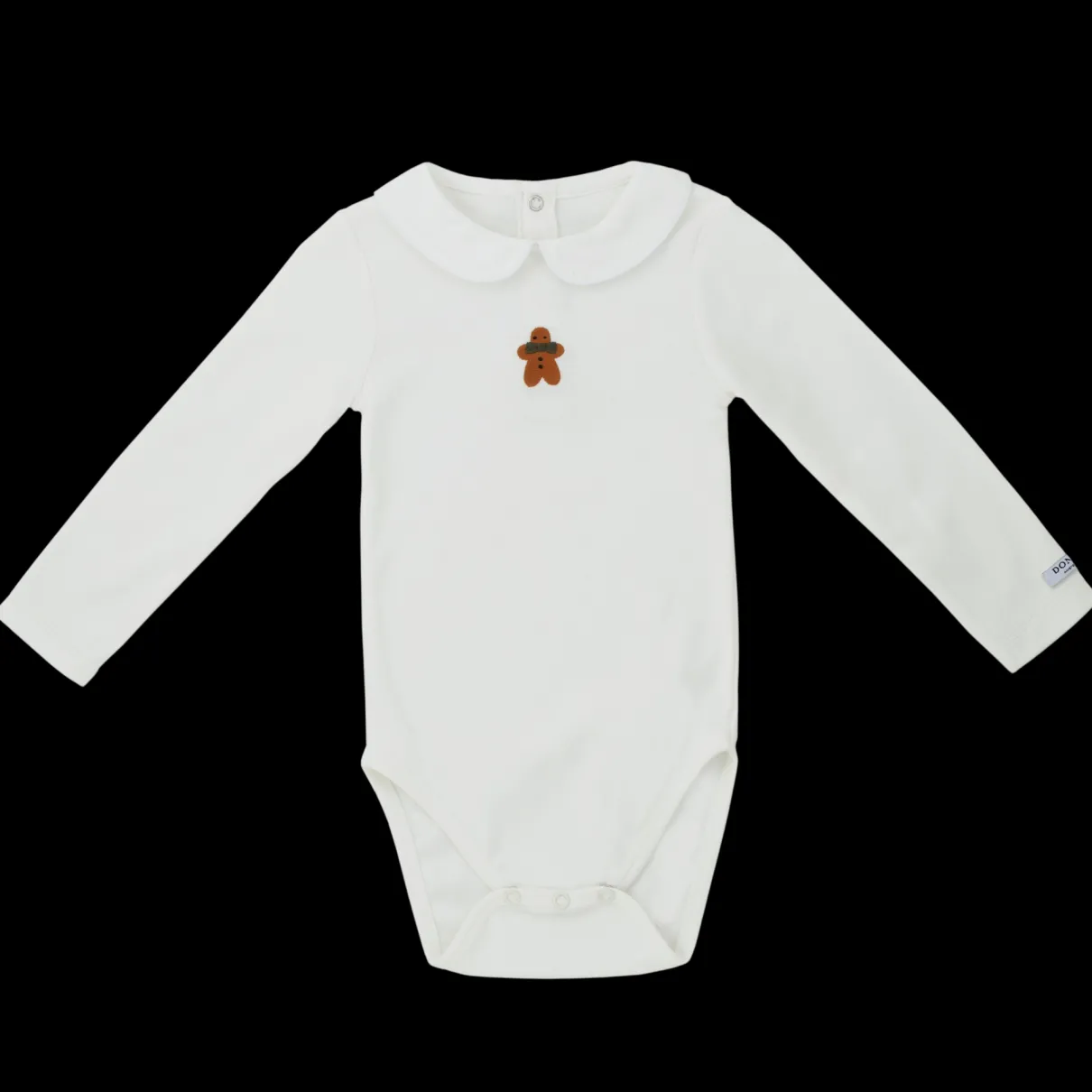 Baby, it’s cold outside! The Kris bodysuit is a charming festive wardrobe essential. The romper features snap fasteners along the back and crotch and a cute Peter Pan collar. A gingerbread embroidered embellishment adds a lovely holiday touch to the item.