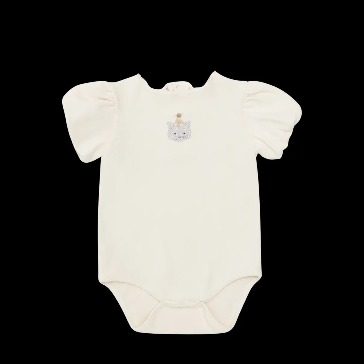 Celebrative cat! The Nowie Bodysuit is a charming everyday essential. Let your little darling wear it as is, or layer it with a Donsje cardigan or jacket. Its beautiful puff-sleeve design and lovely embroidery at the front make this item truly stand out. Snap fasteners along the back and at the crotch, along with elasticated sleeve openings, ensure comfort in wearing all day long.