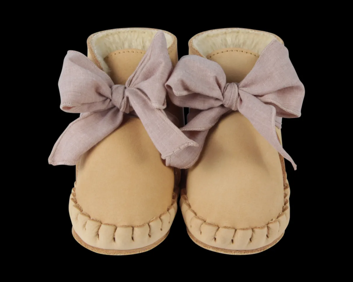 Bows and laces! The Pina Organza Lining shoes are easy to fasten thanks to the beautiful, wide organza laces. Perfect for long-awaited first steps! Made from 100% premium cow leather with a faux fur lining, designed for optimal foot development.